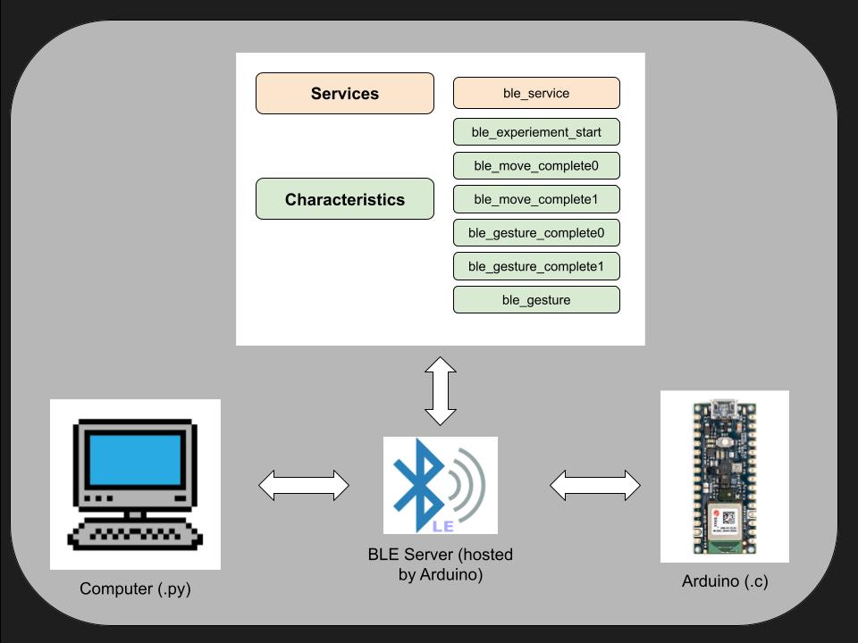 A python script connects to the Arduino via a BLE server. Each "characteristic" contains one byte of information. One byte is used to indicate the start / end of the experiment. The other characteristics convey information about that trial.