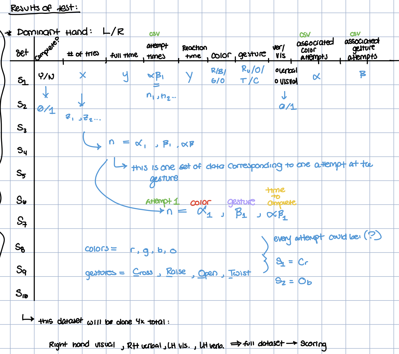 | Attempt | Color | Gesture Detected | Gesture Requested | Success | Reaction Time | Move Time |
