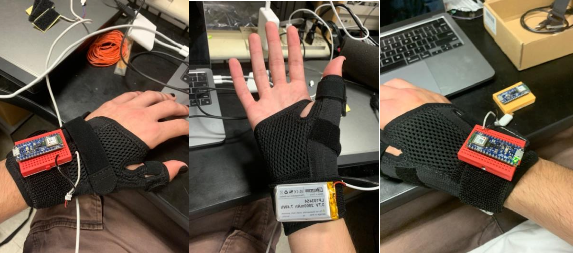 An Arduino nano is connected to the patient's wrist, along with a small 3.3V battery. For tests involving both hands, the setup is duplicated for the non-dominant hand. A computer is set on an adjacent table with the testing program loaded. The user must interact with the computer to begin the test, but everything else is automatic. The accelerometer and gyroscope are both sampled at 104 Hz. This gives the software a profile of the X, Y, and Z orientations in space.