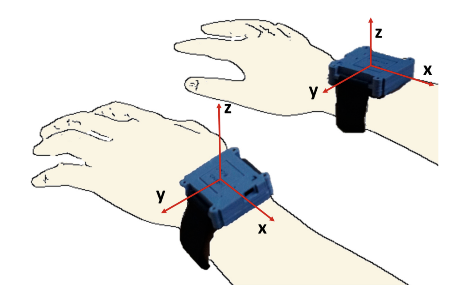 Device mounted to wrist. Placed on both hands (dominant, non-dominant)